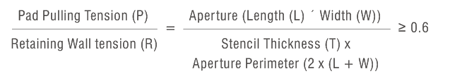 - So new design guide was introduced known as Area ratio, defined as the area of the aperture opening divided by the area of aperture walls. The walls of the aperture are trying to hold the paste in the aperture, while the pad under the aperture opening tries to pull the paste away.